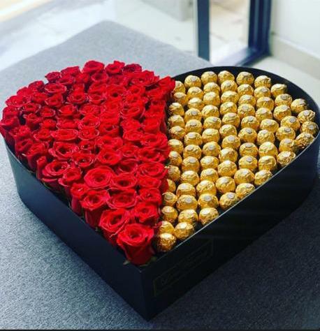 CORAZON CON 100 ROSAS ROJAS DE INVERNADERO Y 75 CHOCOLATES FERRERO