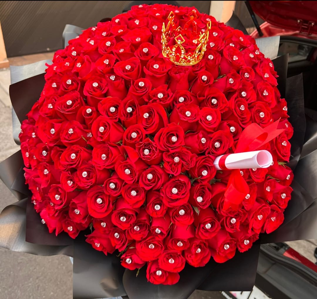 RAMO BUCHON CON 200 ROSAS ROJAS 1 PIN EN CADA ROSA Y CORONA DE METAL